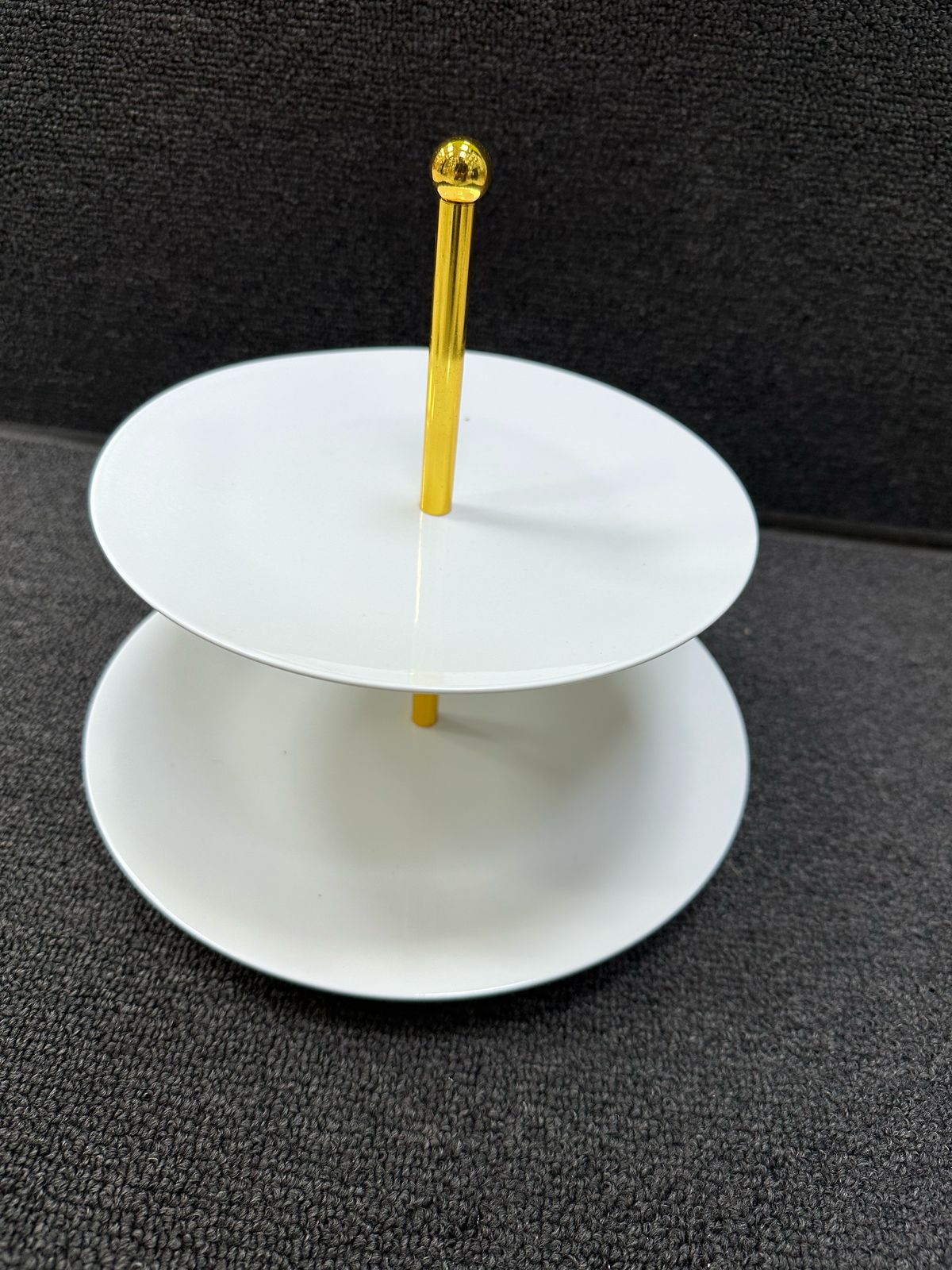 wo-tier serving stand with a gold handle.