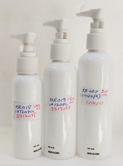 White plastic pump bottles for liquid dispensing, available in 100ml, 150ml, and 200ml sizes.