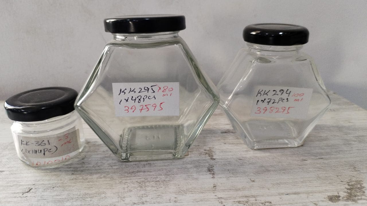 Transparent hexagonal glass jars with black screw lids, available in sizes 180ml, 100ml, and 5ml.