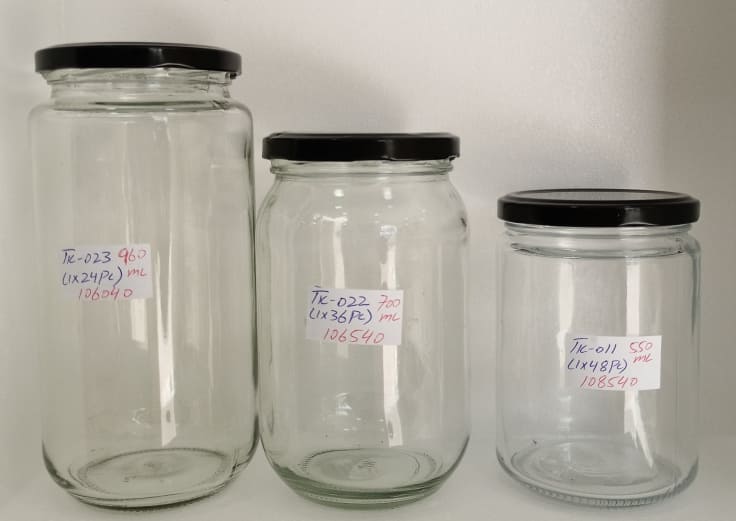 glass jars with black lids, available in 550ml, 700ml, and 960ml sizes.